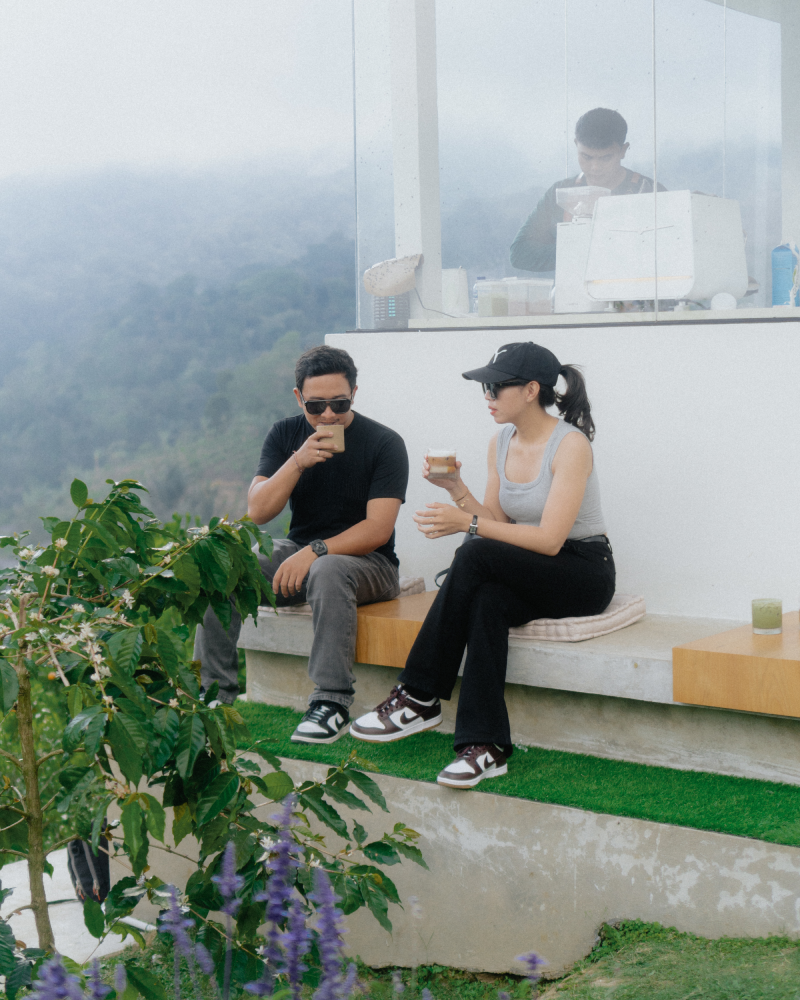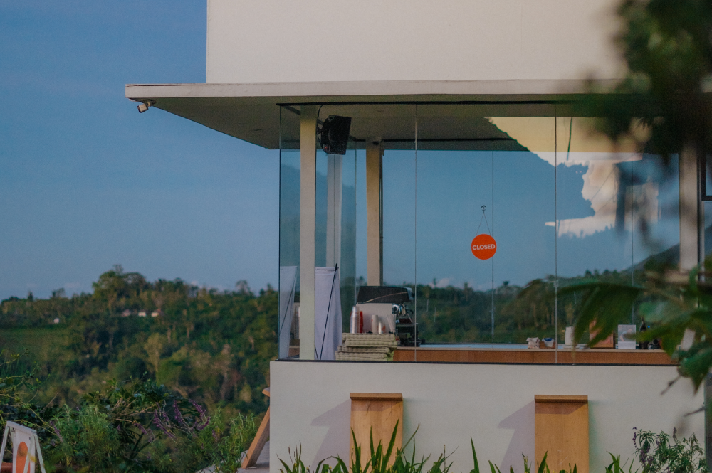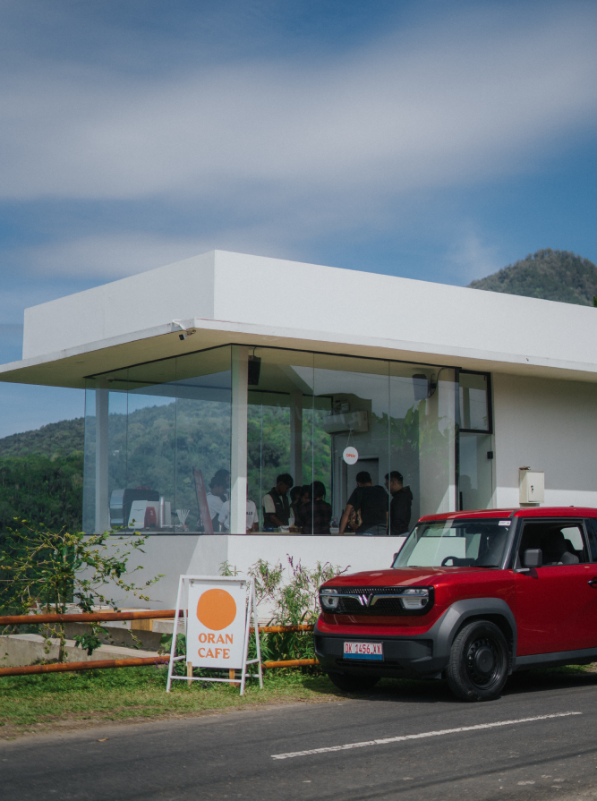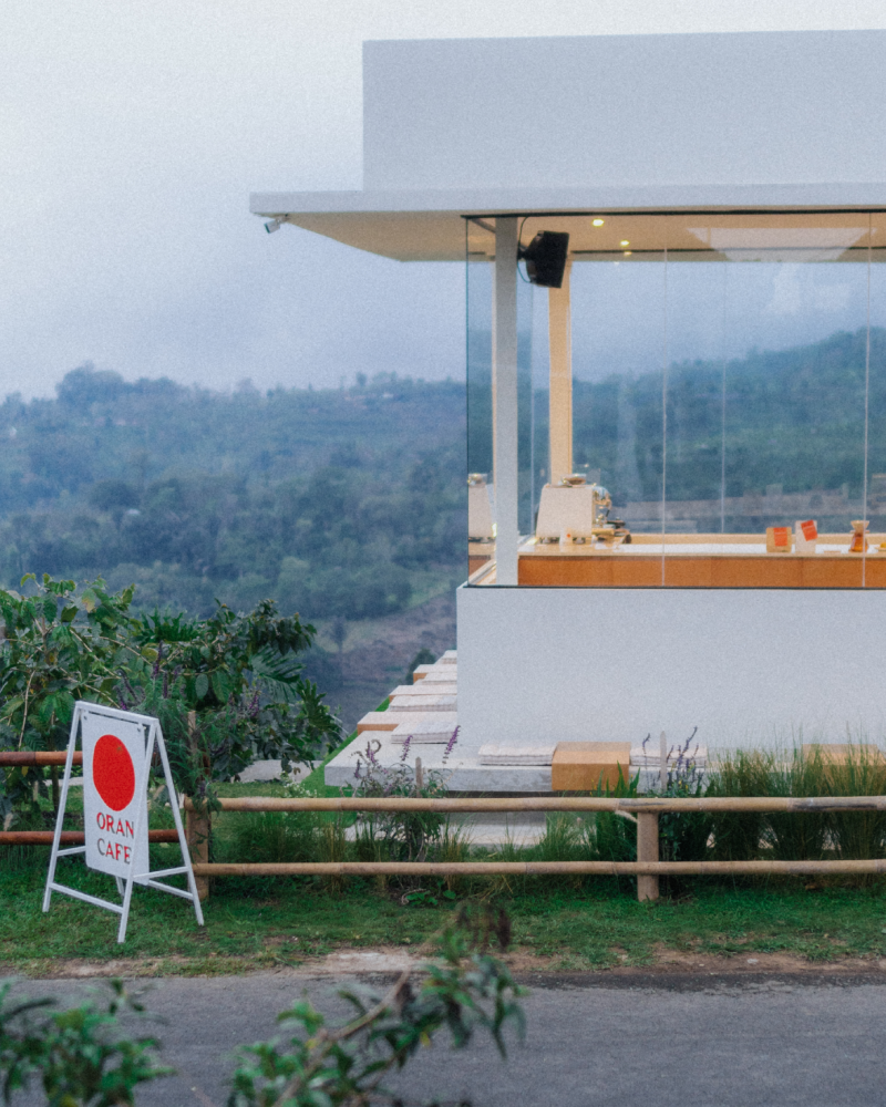Oran Cafe is a masterpiece of tropical-modern design. The cafe’s minimalist white structure features expansive floor-to-ceiling glass windows, erasing the boundary between the chic interior and the lush green landscape outside. The stunning natural light and the breathtaking views of the surrounding gardens create a tranquil and inspiring atmosphere.